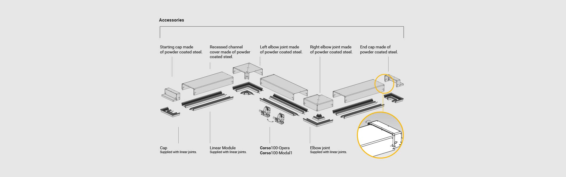 Grazie alle diverse lunghezze disponibili e mediante la combinazione con giunti angolari, Corso100 esprime la sua estrema adattabilità, consentendo svariate tipologie di installazioni e creando sempre armonia con l’ambiente circostante.