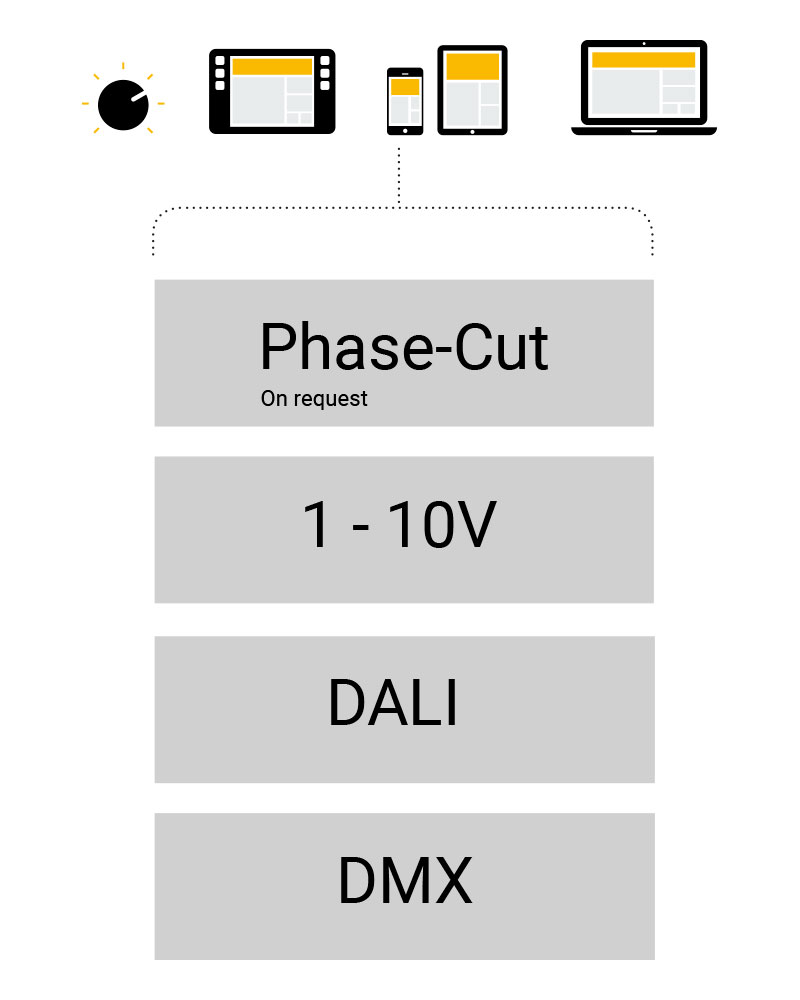 Se disponiamo di apparecchi cablati Phase-Cut, 1-10V, DALI o DMX, controllando la luce dal proprio smartphone, tablet o pc, tramite comunicazione bluetooth o wireless, si possono creare in maniera immediata e user-friendly gli scenari desiderati.